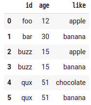 細かい注意点として、元々のdf.likeカラムは不要になったから意図的にdf[['id', 'age']]として排除していることに留意しよう。